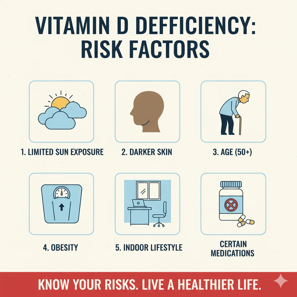 Poor diet: Not consuming enough Vitamin D-rich foods like fatty fish, egg yolks, and fortified dairy products contributes to deficiency.
