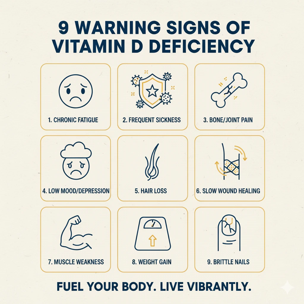 Most people with Vitamin D deficiency don’t notice obvious symptoms at first. However, your body does send signals when levels drop too low. Here are the nine most common warning signs to watch for: